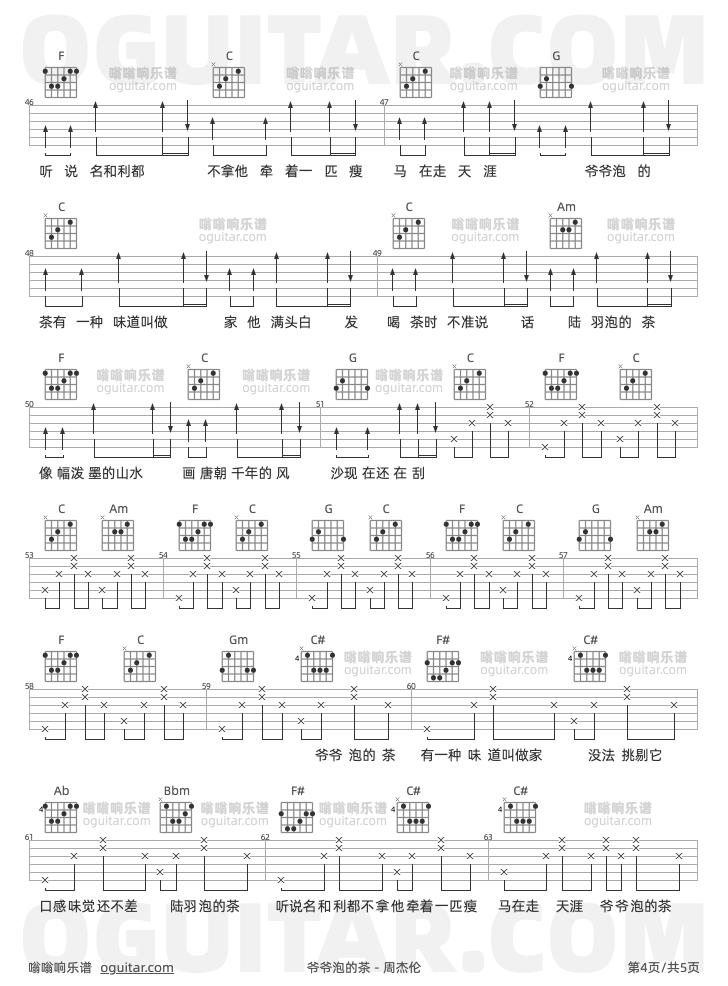 爷爷泡的茶吉他谱,周杰伦歌曲,C调指弹简谱,5张教学六线谱