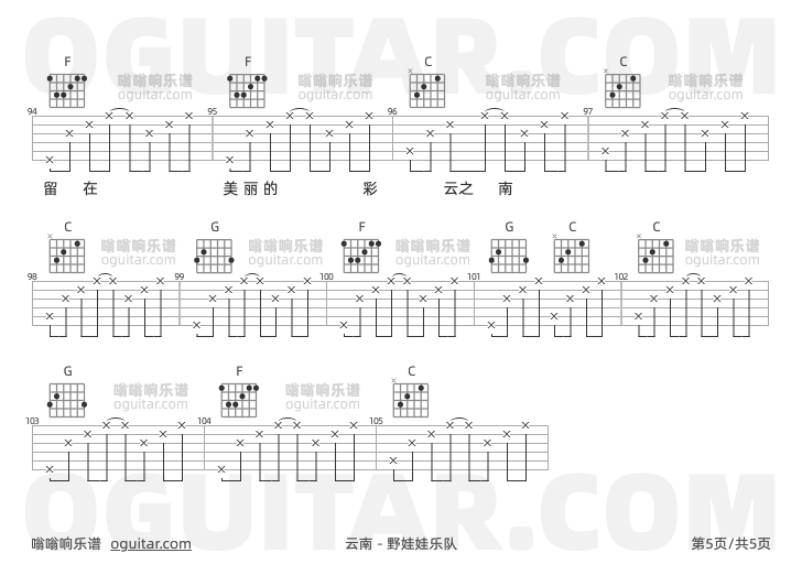 以上就是C调版的云南弹唱简谱,如果正是您所寻找的六线高清图片谱,希望能收藏本站,这里会源源不断更新各种野娃娃乐队的曲谱。