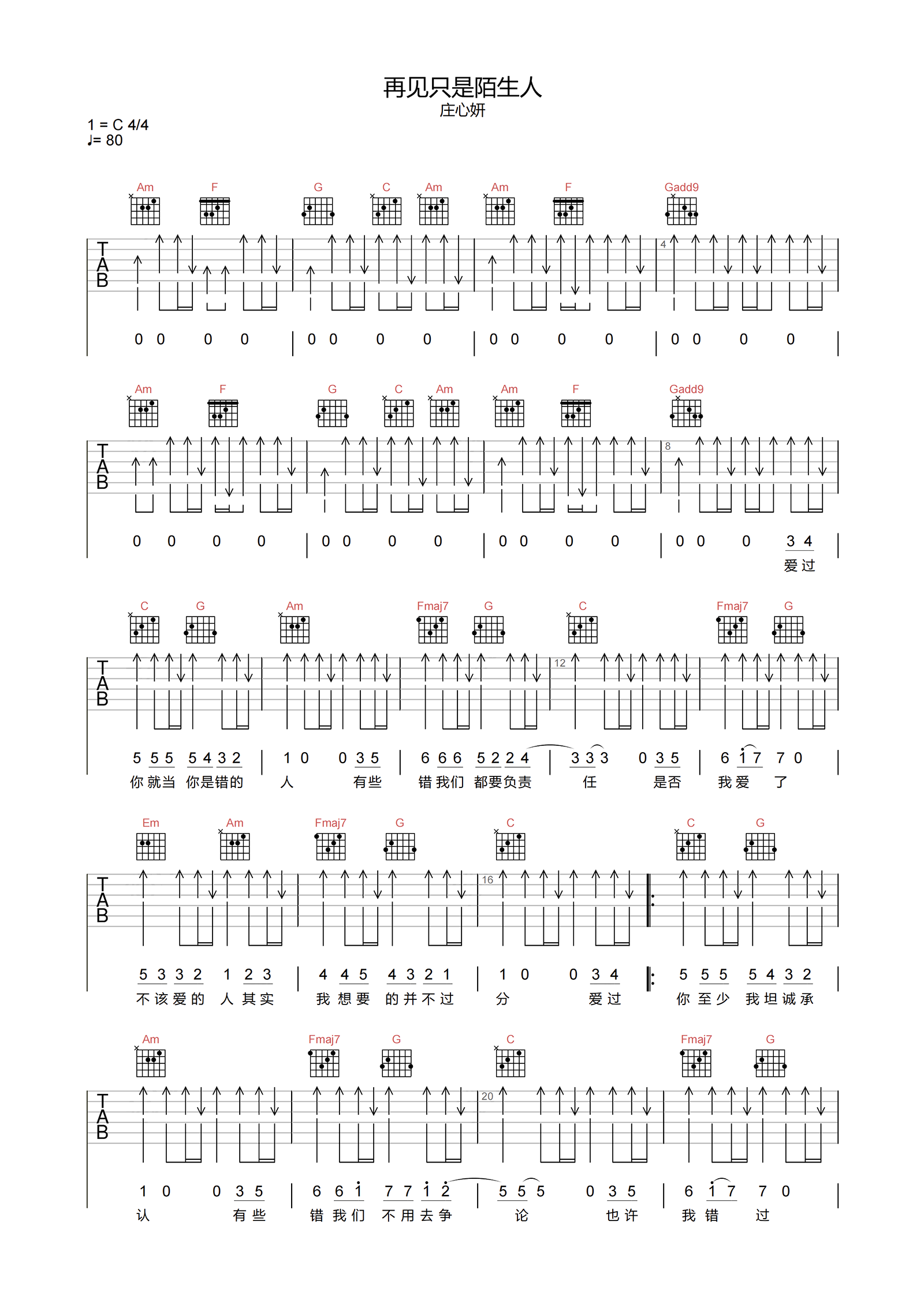 庄心妍《再见只是陌生人》吉他谱-C调扫弦原版弹唱谱是网友提供的高清图谱,w吉他网整理分享给大家,《C》还有C调,D调,F调等不同版本。