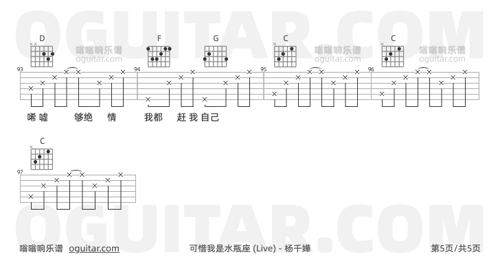 可惜我是水瓶座吉他谱,杨千嬅歌曲,C调指弹简谱,5张教学六线谱【Live版】