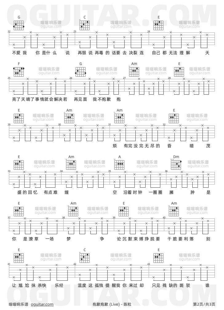 抱歉抱歉吉他谱,陈粒歌曲,C调指弹简谱,3张教学六线谱【Live版】