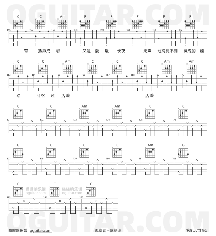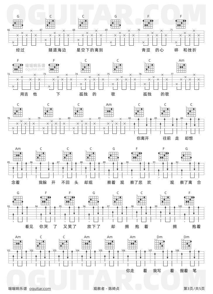观察者吉他谱,陈绮贞歌曲,C调指弹简谱,5张教学六线谱