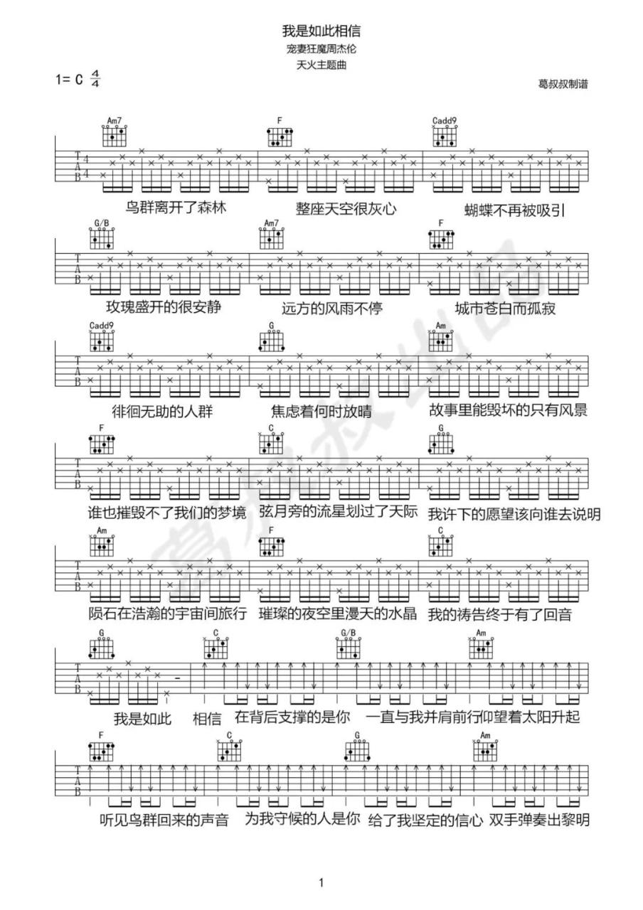 如果您想要学习《天火》主题曲演唱的《我是如此相信》的吉他谱,那么您来对地方了。这首弹唱简谱歌曲的歌词深情大气,让人深深感动。这个完整版弹唱简谱是由于是杰迷,不得不去看呀,加油天火,加油杰伦,适合新手入门学习C调教学吉他谱。这是一首非常好听的歌曲,下面高清图片谱由极网吉它谱更新分享。如果您是吉他爱好者请关注我们的网站!