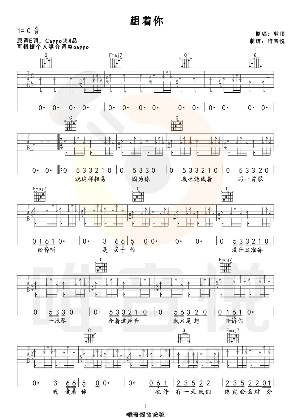 郭顶想着你吉他谱,简单C调原版弹唱曲谱,郭顶高清六线谱图片