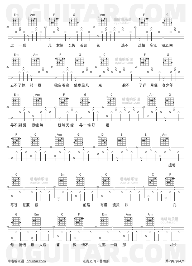 江湖之间吉他谱,曹雨航歌曲,C调指弹简谱,4张教学六线谱