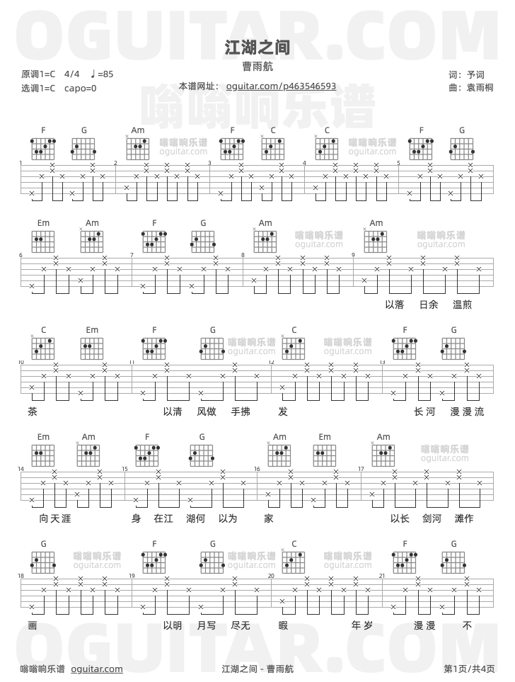 江湖之间吉他谱简单版,它是曹雨航演唱的原版歌曲,指弹六线谱子由嗡嗡响制谱,是一首经典歌曲编配的C调吉他简谱,演唱时可不使用变调夹,演奏弹唱时间为3分29秒,原调为C本谱采用C调,是非常好听的新手弹唱谱,下面4张完整版高清曲谱图片由吉他部落jita2012.com为大家更新分享,有喜欢吉它的朋友欢迎收藏!