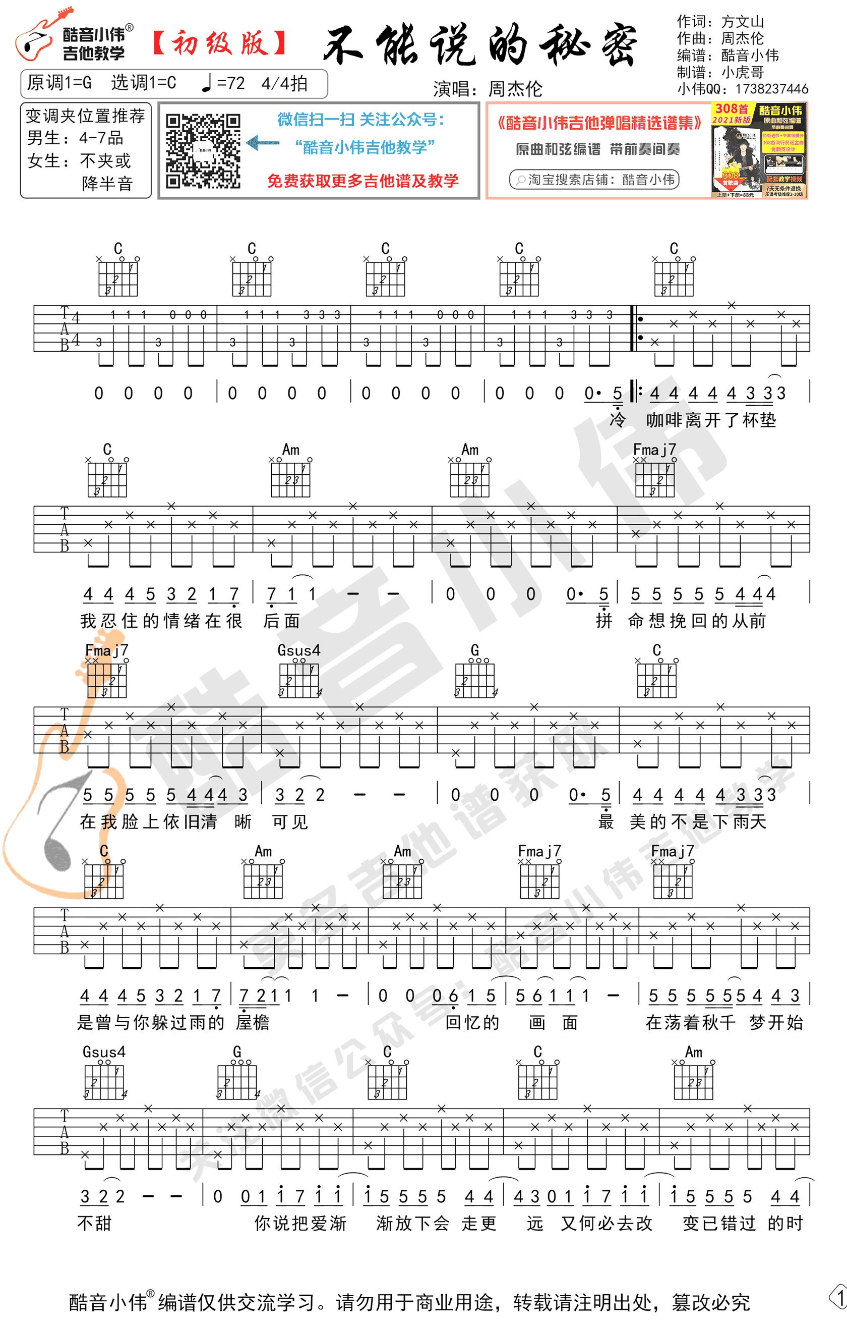 《《不能说的秘密》吉他谱_周杰伦_G调弹唱高清六线谱免费分享,《不能说的秘密》是由周杰伦演唱的一首经典情歌,由方文山作词,周杰伦作曲,也是他自己拍的电影《不能说的秘密》的主题曲。还记得当时笔者听完这个歌曲时,脑海里一直回荡着那一句经典的歌词:最美的不是下雨天,是曾与你躲过雨的屋檐,当时就在想,怎么可以有人写出这么美的歌词,再配合电影中杰伦和桂纶镁躲雨的场景,更有意境了。