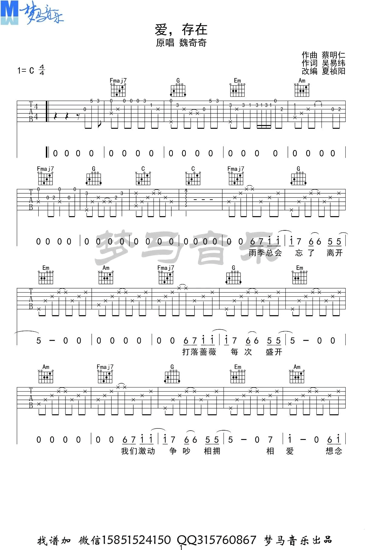 《《爱存在》吉他谱_魏奇奇/王靖雯不胖_C调弹唱谱_高清六线谱分享,《爱存在》是由魏奇奇原唱、王靖雯不胖翻唱的一首歌,这个歌曲是电视剧《流星花园》的主题曲,最近被王靖雯不胖翻唱之后热度又起来了。感情里经历过的人和事让我们成为了最好的自己,通过“王靖雯不胖”的深情演绎,让这个恋爱的季节充满无尽的温暖与治愈。