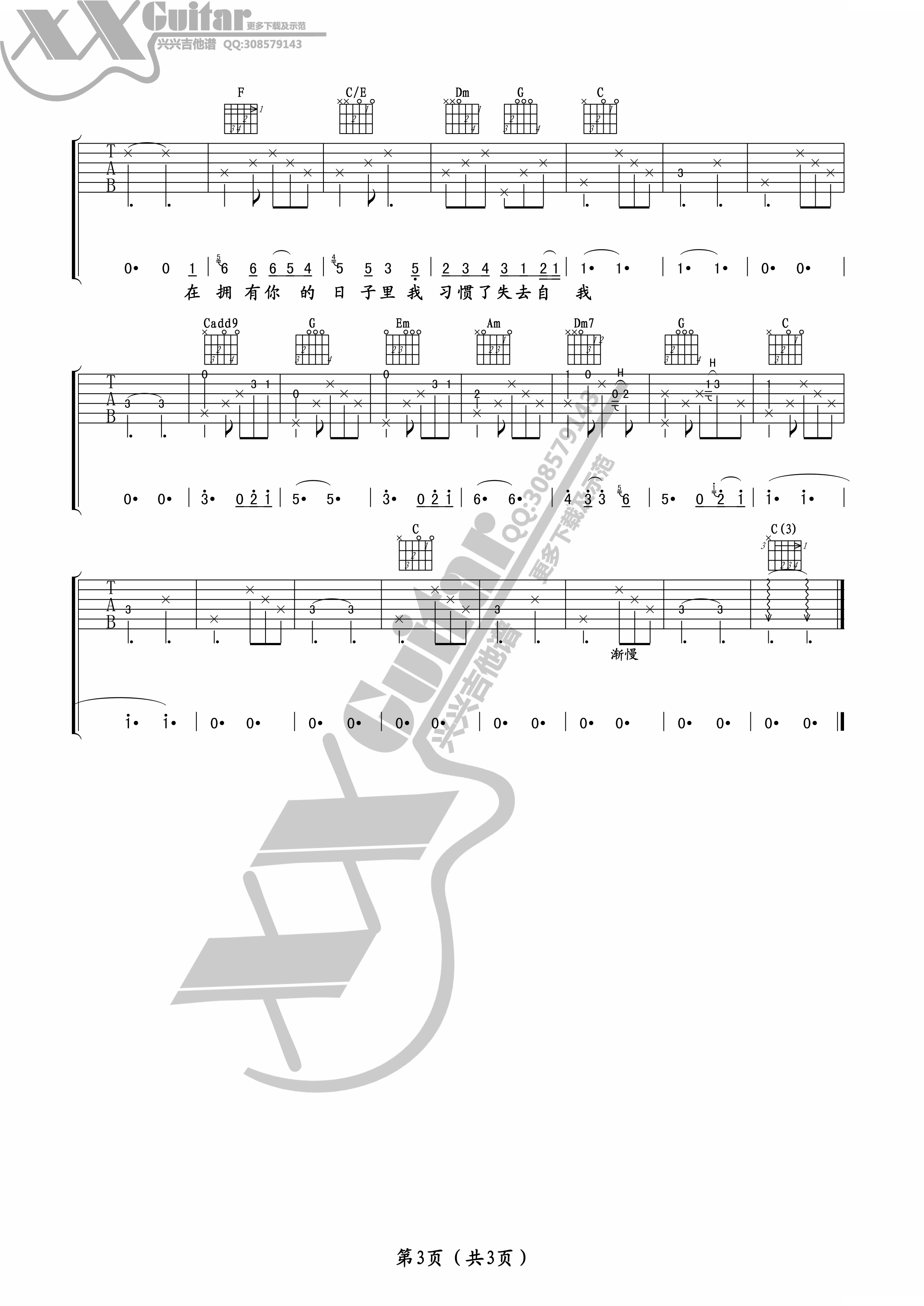 拥有你的日子吉他谱,原版许飞歌曲,简单C调指弹曲谱,高清六线乐谱