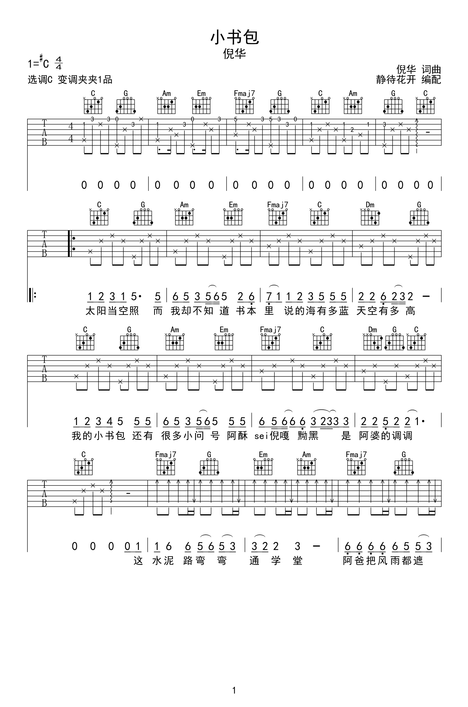 倪华小书包吉他谱,简单C调原版指弹曲谱,倪华高清六线谱教学