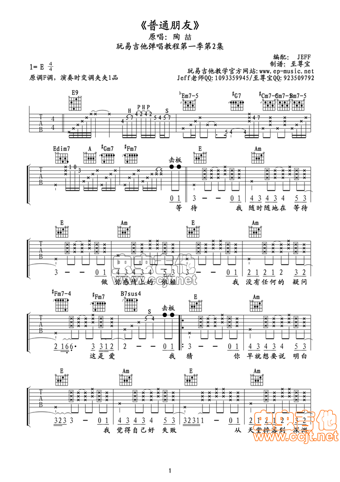普通朋友吉他谱,取自演唱的歌曲是经典E调指弹编配的曲谱,非常好听的弹唱曲谱,下面3张高清曲谱由吉曲谱网为大家更新分享,有喜欢吉它的朋友欢迎关注!