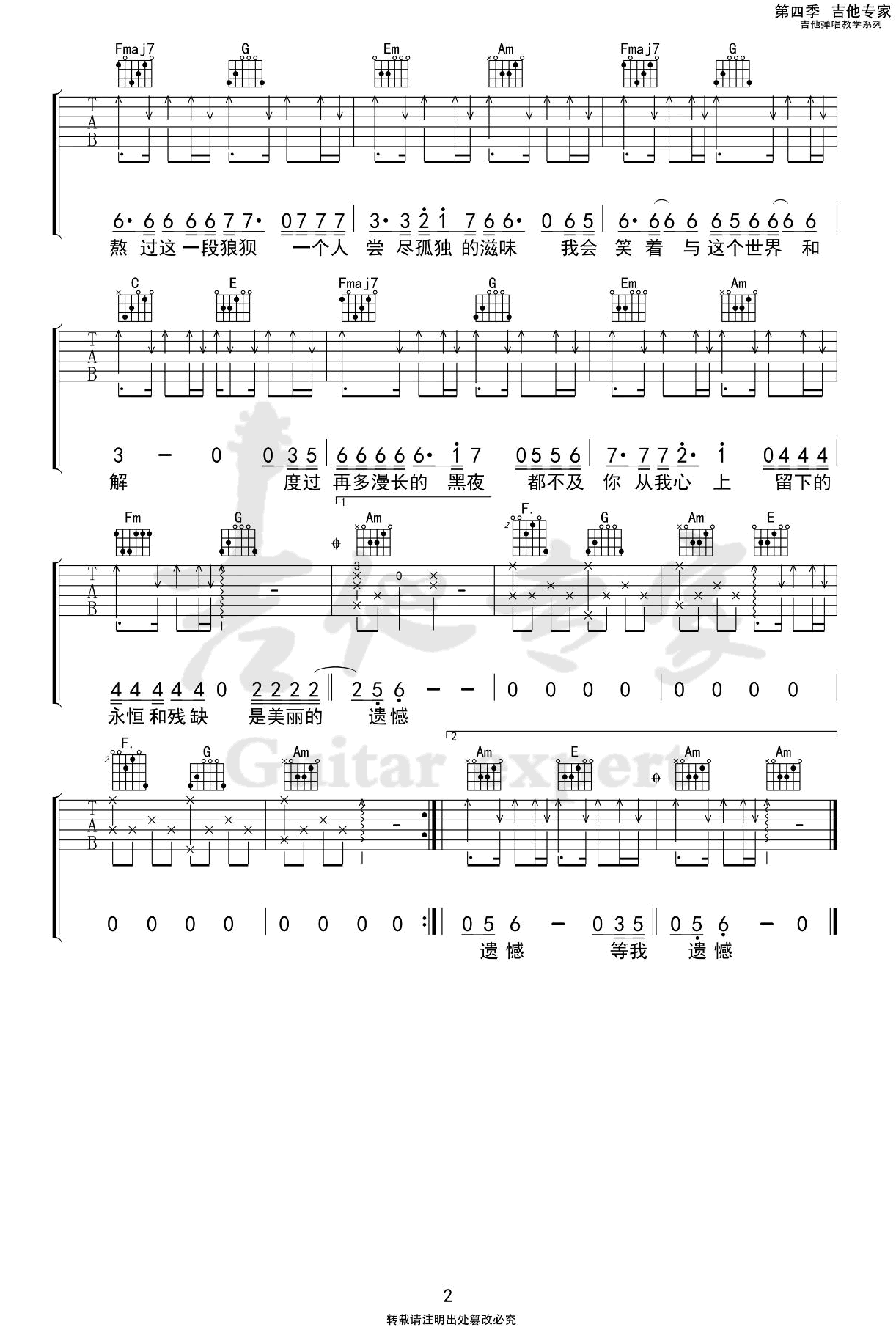 美丽的遗憾吉他谱,取自演唱的歌曲是经典C调指弹编配的曲谱,非常好听的弹唱曲谱,下面5张高清曲谱由吉曲谱网为大家更新分享,有喜欢吉它的朋友欢迎关注!