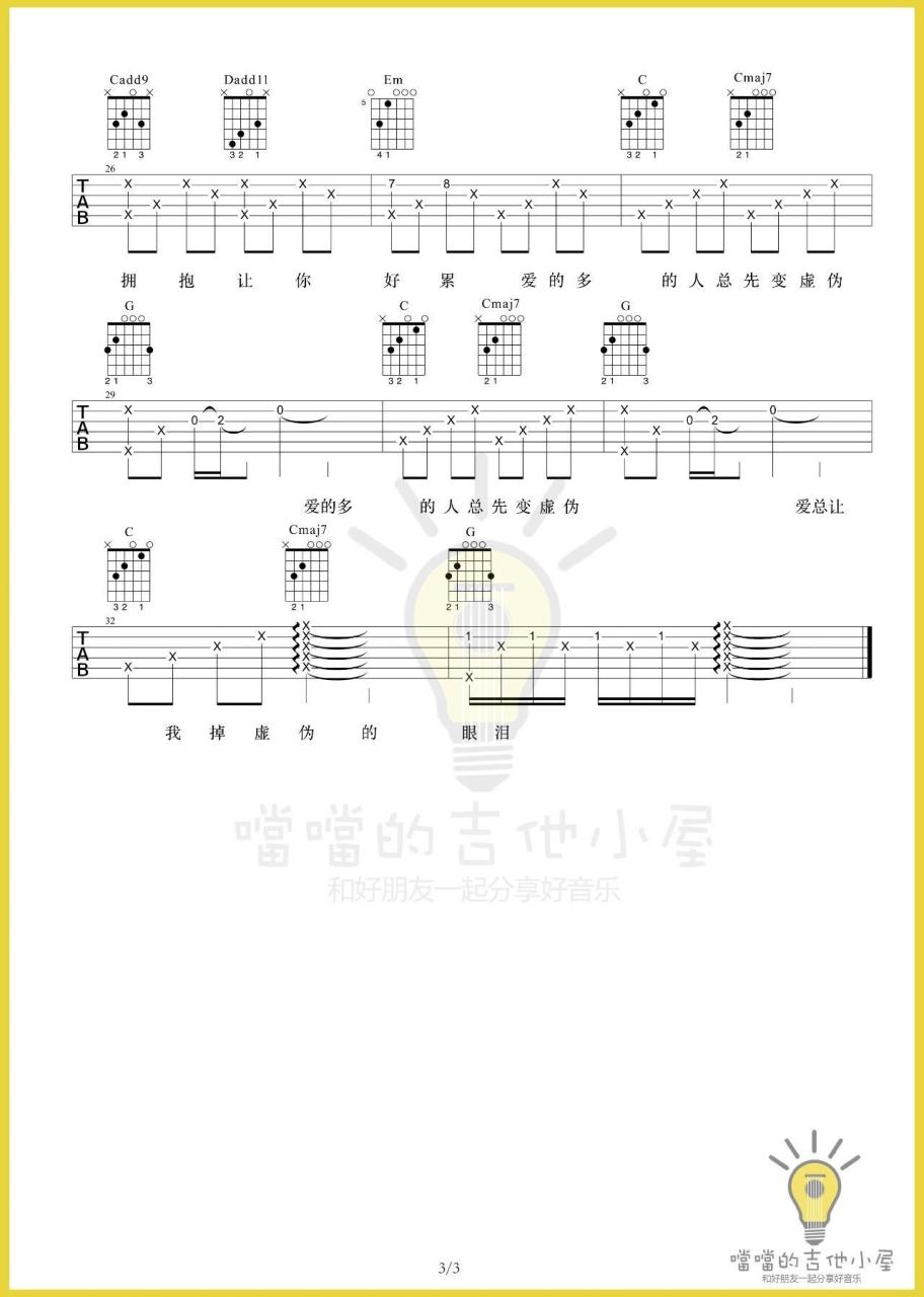 静止吉他谱,取自演唱的歌曲是经典G调指弹编配的曲谱,非常好听的弹唱曲谱,下面4张高清曲谱由吉曲谱网为大家更新分享,有喜欢吉它的朋友欢迎关注!