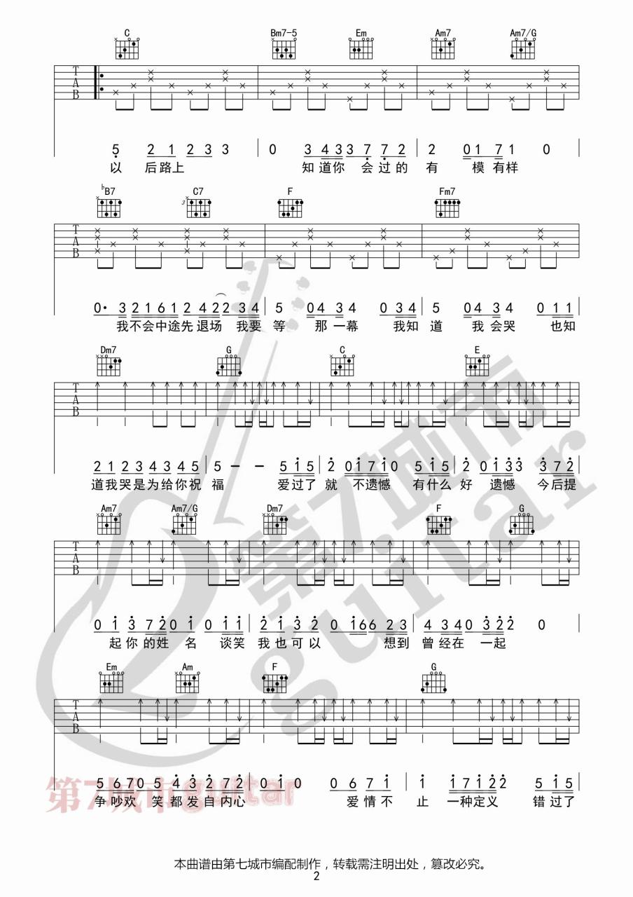 李荣浩不遗憾吉他谱,简单C调原版指弹曲谱,李荣浩高清六线谱图片