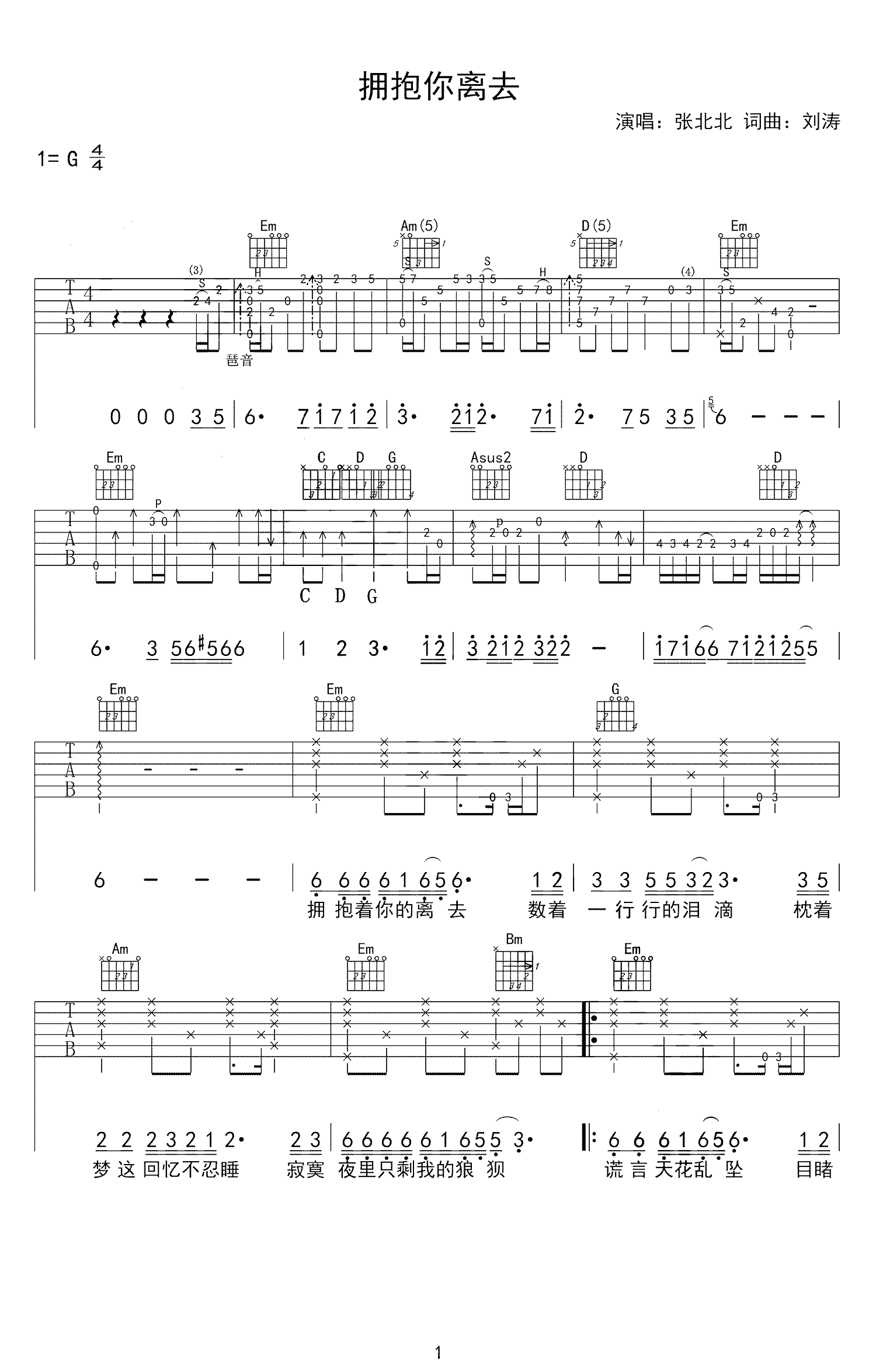 拥抱你离去吉他谱,原版张北北歌曲,简单G调指弹曲谱,高清六线乐谱