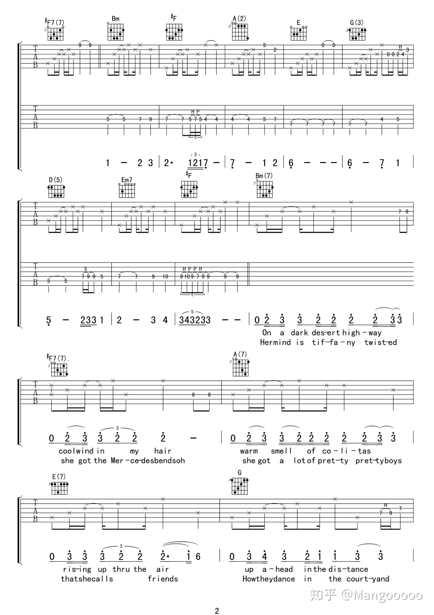 经典加州旅馆吉他谱,简单D调原版指弹曲谱,老鹰乐队高清六线谱教学