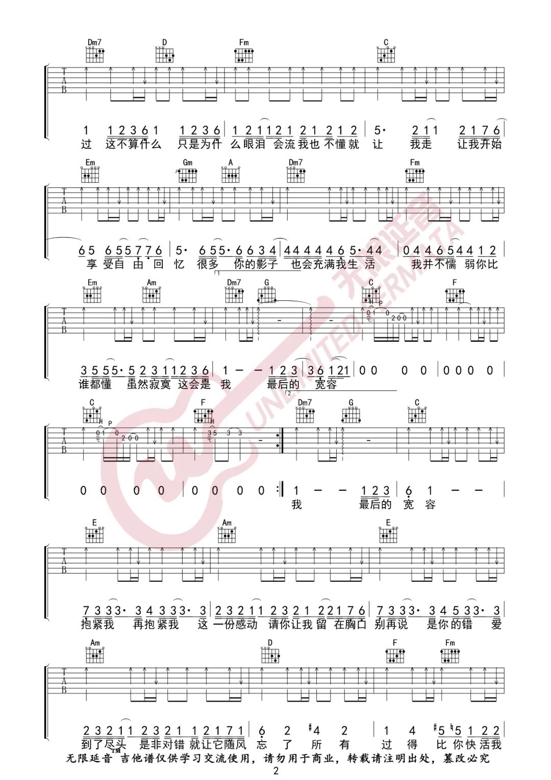 孙燕姿我不难过吉他谱,简单C调原版弹唱曲谱,孙燕姿高清六线谱附歌词