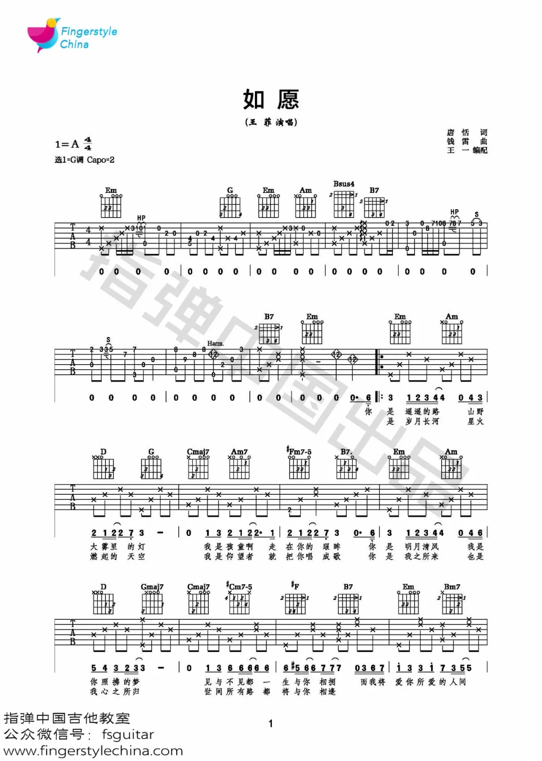 如愿吉他谱六线谱,王菲吉他歌曲里其中一首,采用G调原版弹唱六线谱图片,歌曲原调为A调,这里采用了G调指法进行编配,演唱时夹变调夹2品可回到原调。
