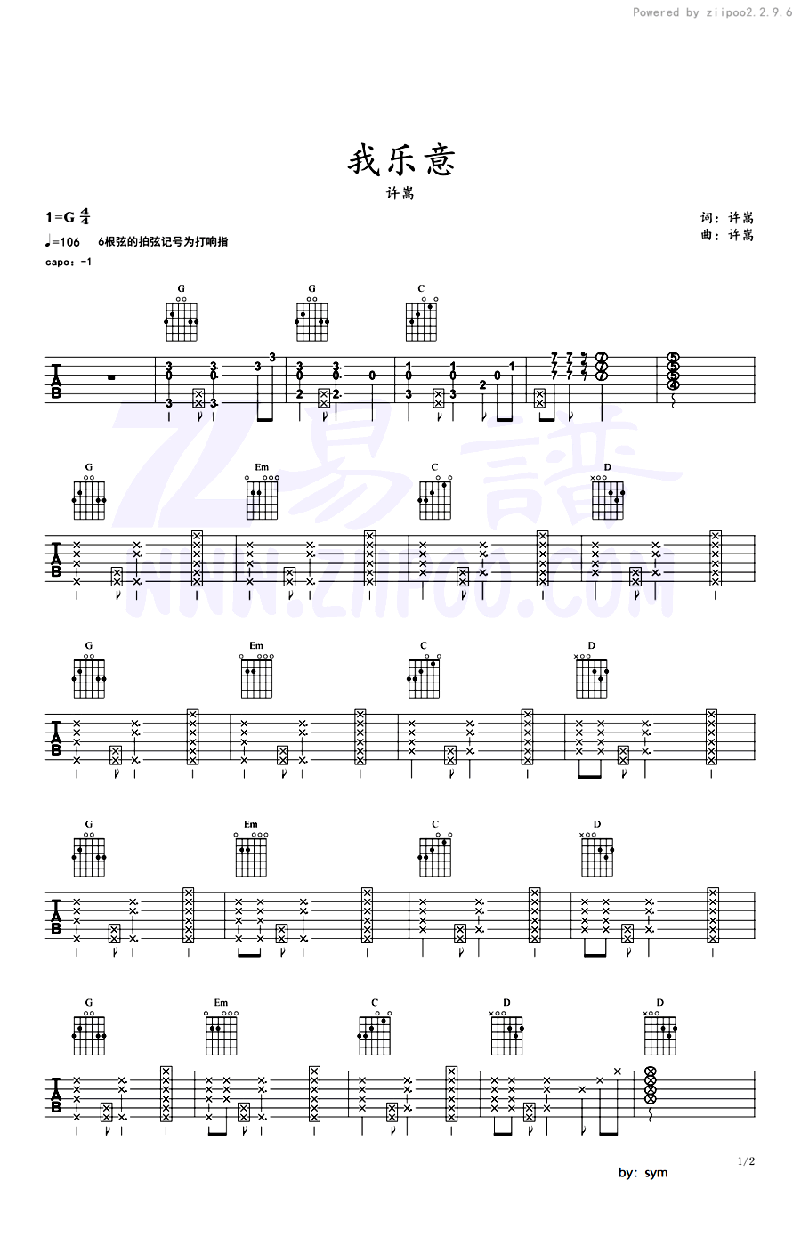 许嵩我乐意G调指弹简单版吉他谱子,六线简谱是吉他坊整理, 是非常好听的入门弹唱曲谱,下面为大家分享高清图片谱,有喜欢吉它的朋友欢迎关注!