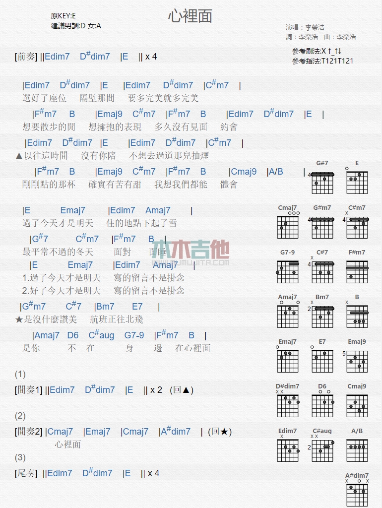 如果您想要学习李荣浩演唱的《心里面》的吉他谱,那么您来对地方了。这首弹唱简谱这首歌曲非常流畅,让人听了很舒服。这个完整版弹唱简谱是由木木吉他便被完成,适合新手入门学习E调教学吉他谱。这是一首非常好听的歌曲,下面高清图片谱由极网吉它谱更新分享。如果您是吉他爱好者请关注我们的网站!