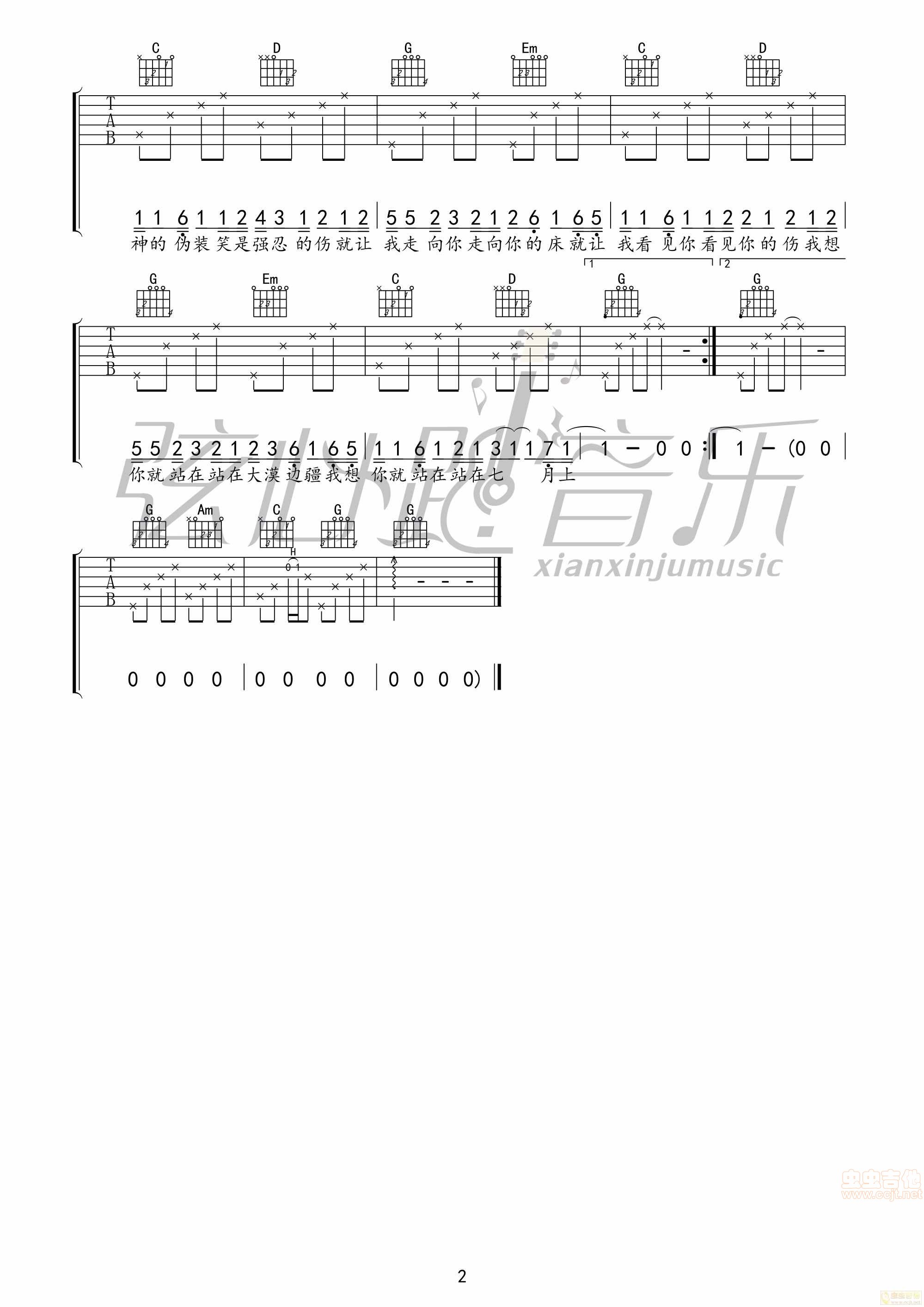 七月上吉他谱,原版歌曲,简单G调弹唱教学,六线谱指弹简谱2张图