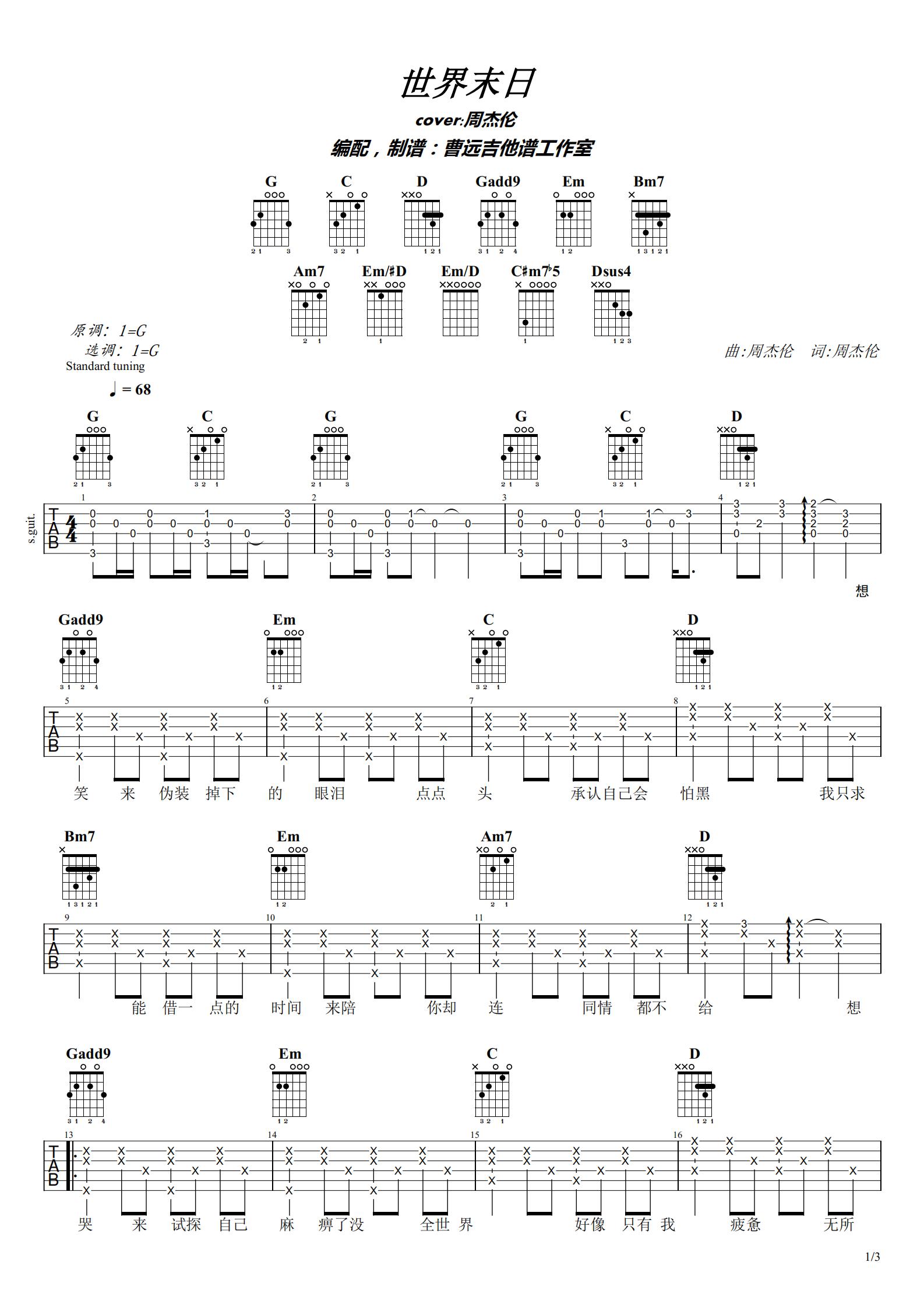 世界末日吉他谱,取自演唱的歌曲是经典G调指弹编配的曲谱,非常好听的弹唱曲谱,下面3张高清曲谱由吉曲谱网为大家更新分享,有喜欢吉它的朋友欢迎关注!