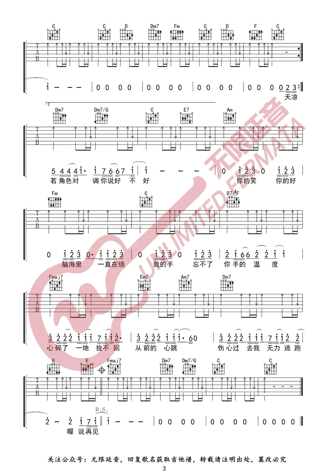 周杰伦说了再见吉他谱,简单C调原版指弹曲谱,周杰伦高清六线谱图片