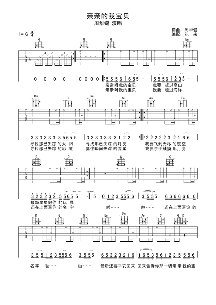 以上就是周华健的G调版的(亲亲我的宝贝)曲谱全部内容,如果正是您所寻找的六线高清图片谱,希望能收藏本站,这里会源源不断更新各种周华健的曲谱。无论你喜欢歌曲还是纯音乐,我们都有丰富的完整版、前奏、独奏等吉他谱供你挑选和推荐,让你的音乐之路更加丰富多彩。