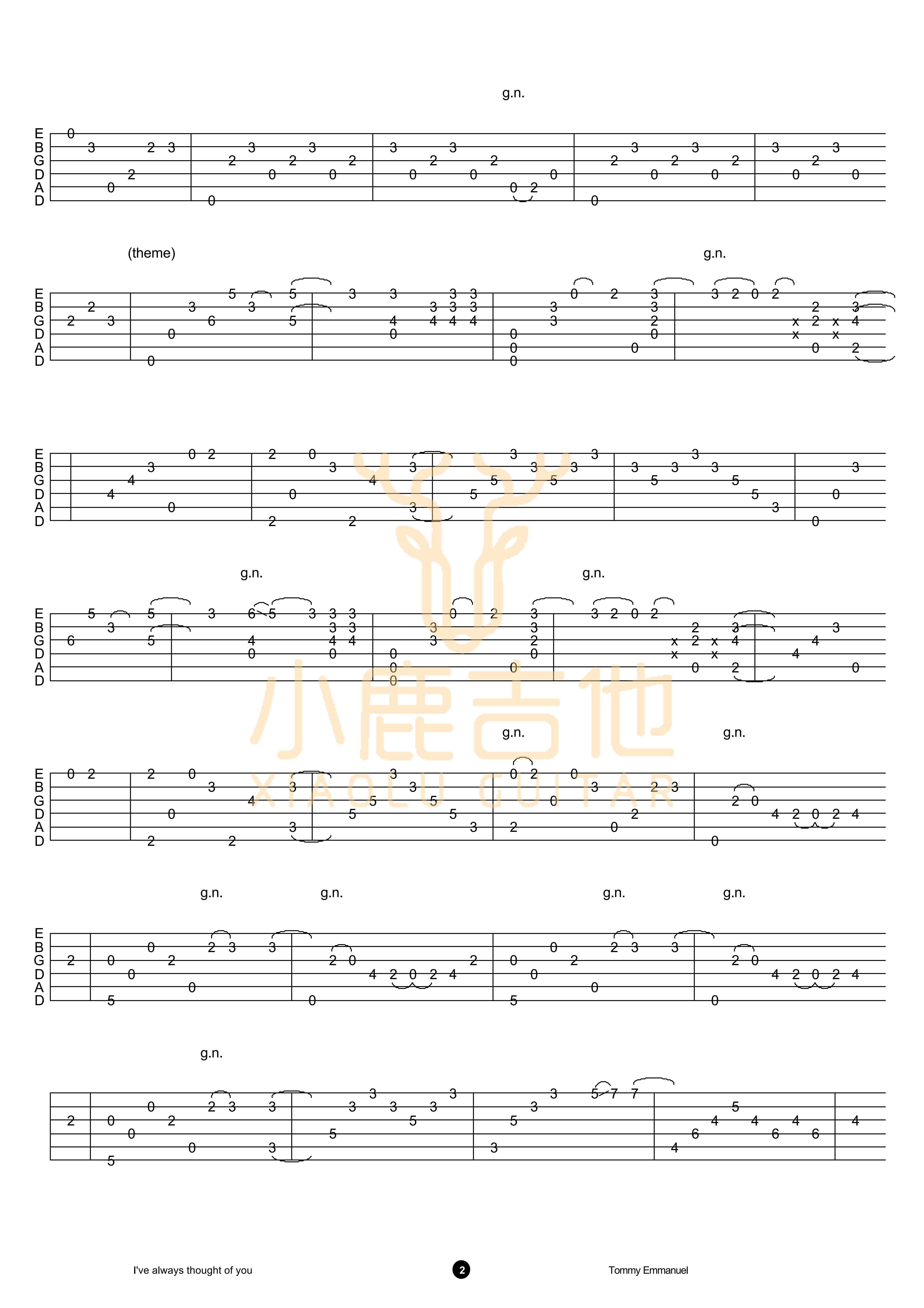 I Have Always Thought Of You-Tommy Emmanuel指弹吉他谱,由小鹿吉他制作上传。Tommy Emmanuel,国人称其大神汤米,是著名吉他大师。近年,其神仙打架系列视频在各平台颇为走红,似乎有点老而弥坚。 汤米音乐领域宽泛,爵士、古典、乡村、摇滚和布鲁斯各种音乐风格无所不能。在神仙打架系列中他频频跨界,与各个领域顶级高手合作,展现出其高超的技法。