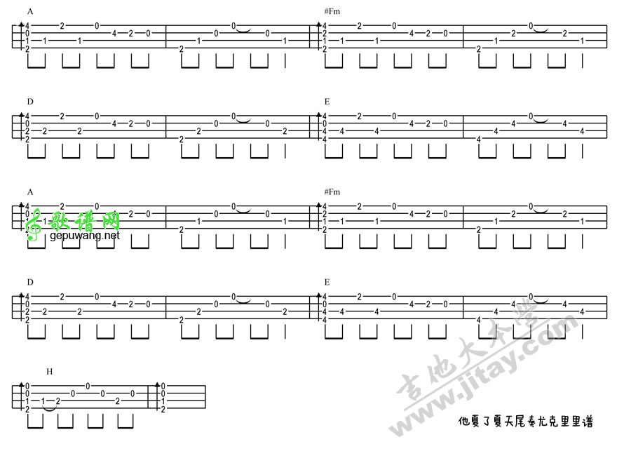 他夏了夏天吉他谱采用了A调指法,由吉他大本营编配完成。这首歌名就足够有画面感,让人仿佛回到了那个闷热的夏天,那个走在街上大汗淋漓,吃着雪糕冰爽快乐的那个夏天,吴青峰的嗓音清新干净,搭配上这首歌曲动人的旋律,为这个夏天带来了一丝凉意,夏天是离别的季节,也是相遇的季节,在这个夏天发生了很多很多的事情,让人印象深刻,多年以后想起,嘴角还是忍不住上扬。