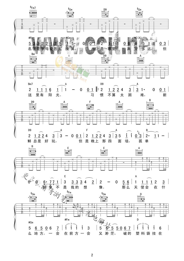 周笔畅天使之城吉他谱,简单A调原版指弹曲谱,周笔畅高清六线谱图片