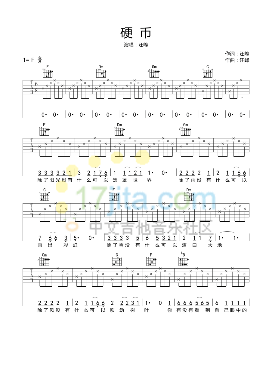 硬币吉他谱,汪峰歌曲,F调指弹简谱,新手弹唱简单版