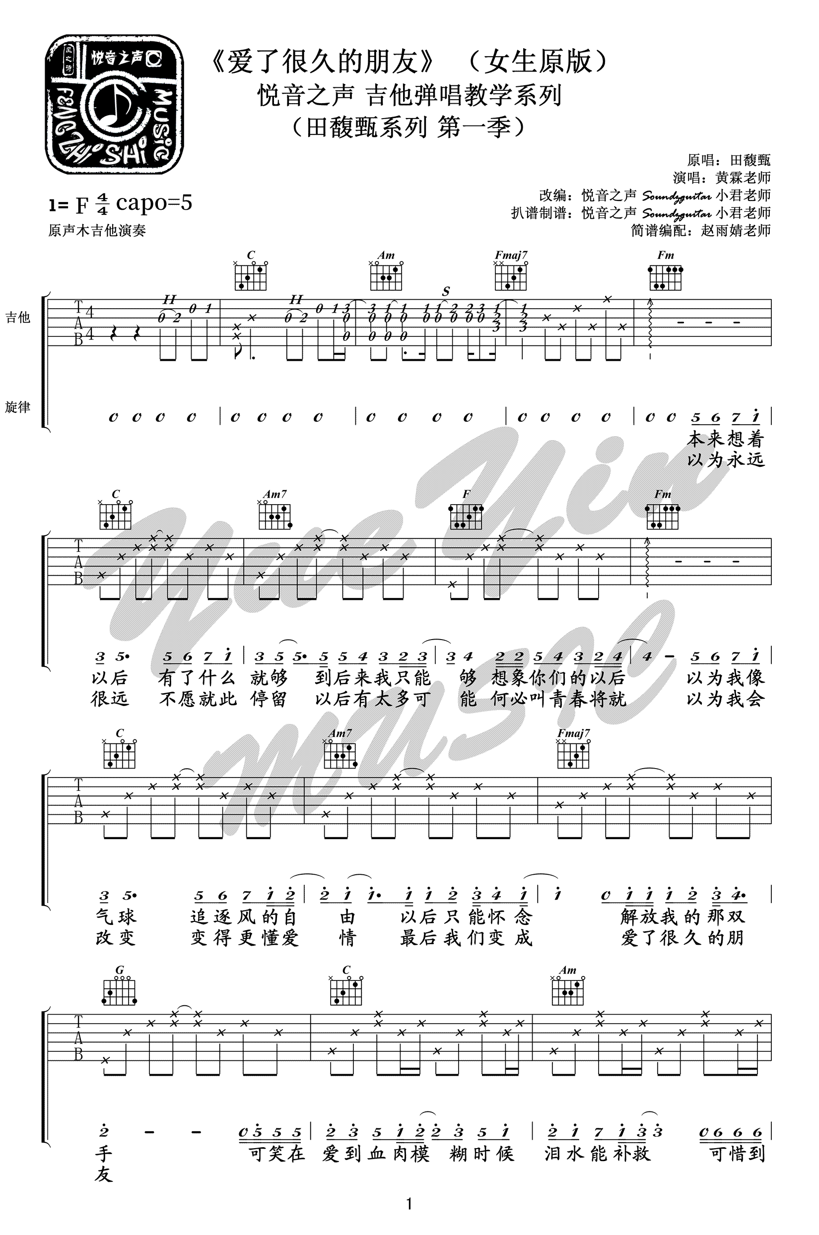 爱了很久的朋友吉他谱,原版田馥甄歌曲,简单C调指弹曲谱,高清六线乐谱