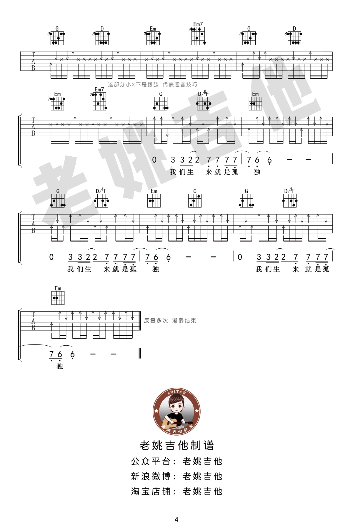 静止吉他谱,原版歌曲,简单G调弹唱教学,六线谱指弹简谱4张图