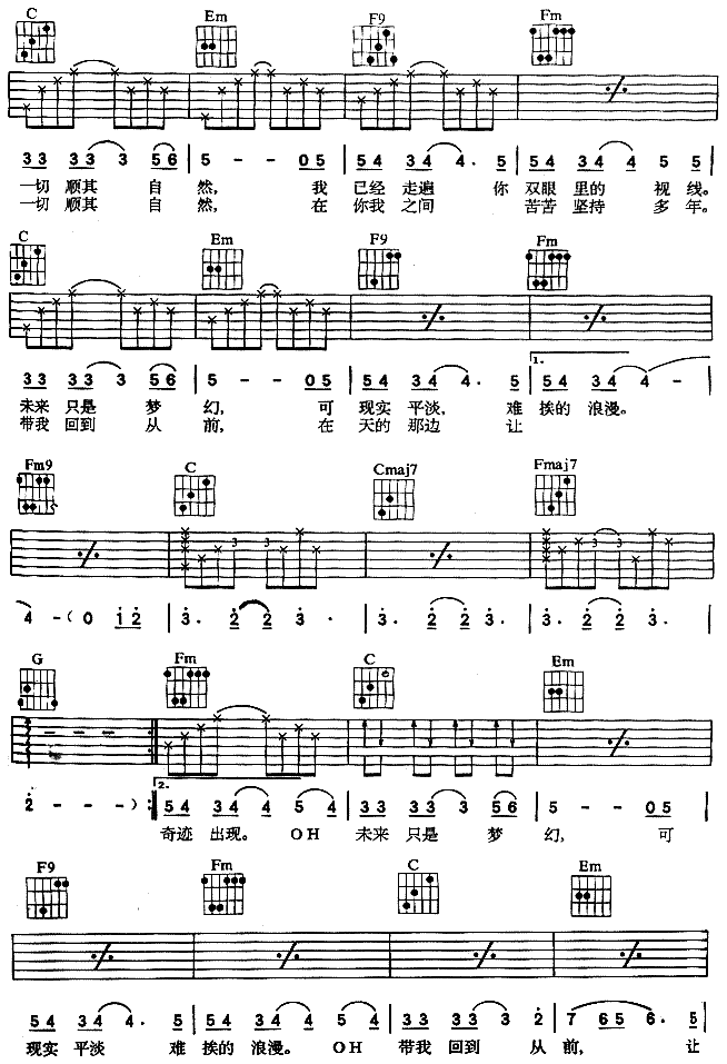顺其自然吉他谱,它是演唱的歌曲,是一首经典歌曲编配的C调指弹六线简谱,这首歌的节奏让人忍不住跟着跳动。是非常好听又简单的吉他弹唱曲谱,下面3张高清完整版图片谱由曲谱网为大家更新分享,有喜欢吉它的朋友欢迎关注!