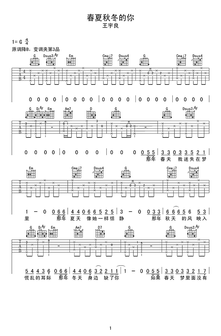 以上就是G调春夏秋冬的你吉它谱,如果正是您所寻找的王宇良六线高清图片谱,希望能收藏本站,这里会源源不断更新各种的曲谱。