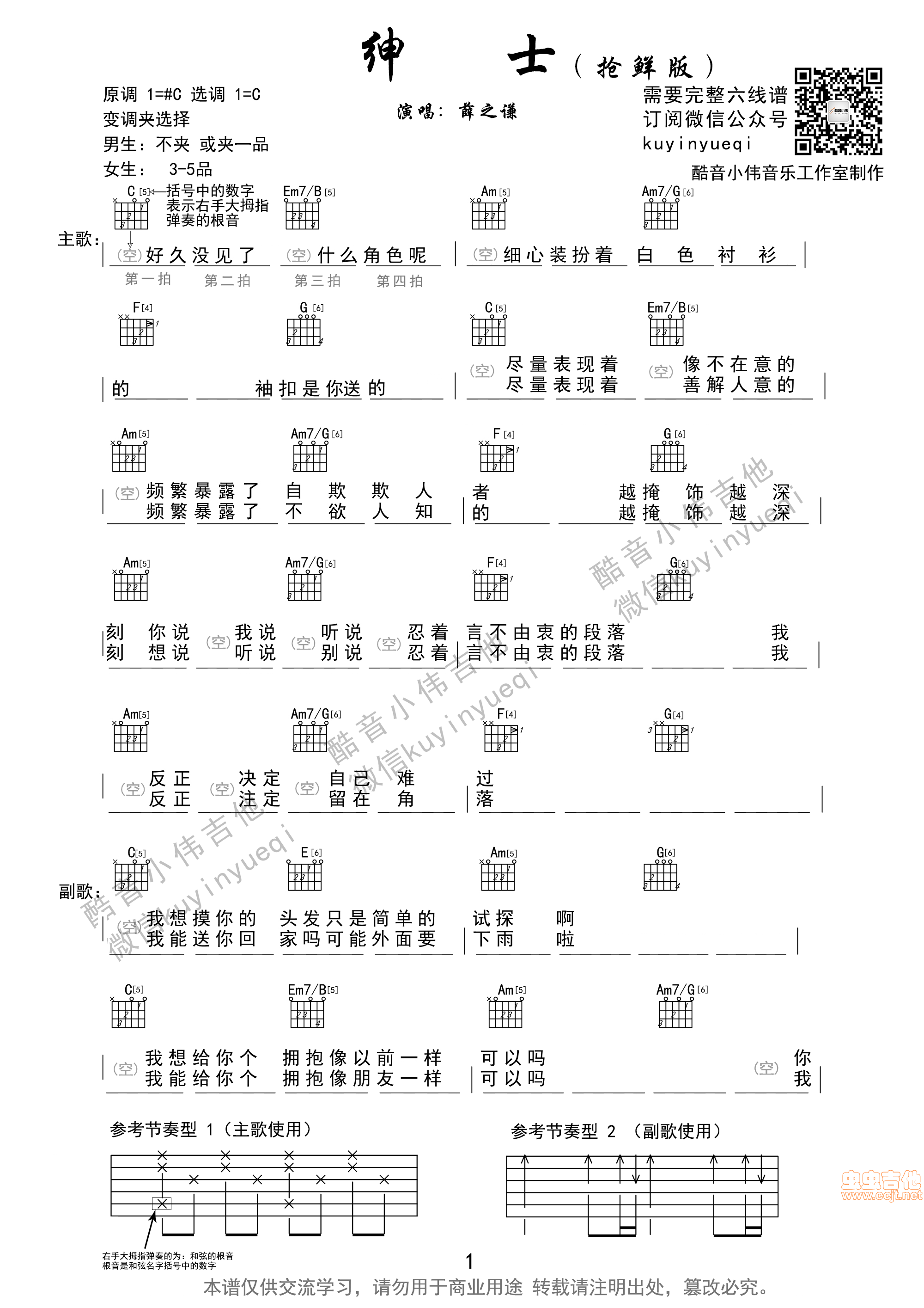 钟吉他谱,原版歌曲,简单G调弹唱教学,六线谱指弹简谱5张图