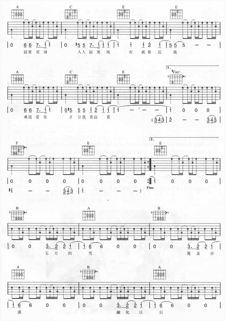 寂寞星球吉他谱本曲谱是选用了E调指法,由熊健民编配完成。这首歌曲虽然不是五月天众多音乐作品中比较出众的那一首,但也是很好听的一首音乐作品,在这首歌曲之中,我们能够感受到五月天他们的音乐风格和音乐特点,让我们感受到了一种独一无二的感觉,我们每一个人都在自己的寂寞星球里面,渴望着有一天能够遇到一个人,和我们一起,让这一只寂寞的星球不再寂寞,温暖我们的整个世界。