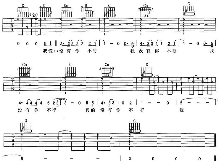 没你不行吉他谱,附前奏歌曲,G调指弹简谱,新手弹唱六线谱
