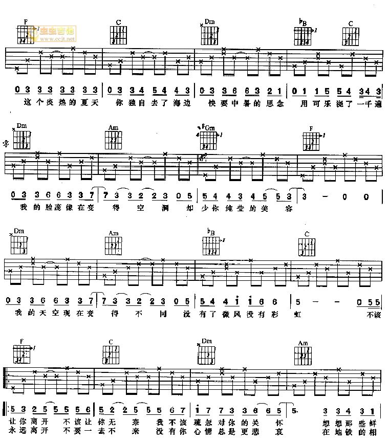 中暑的思念吉他谱,原版歌曲,简单F调弹唱教学,六线谱指弹简谱4张图