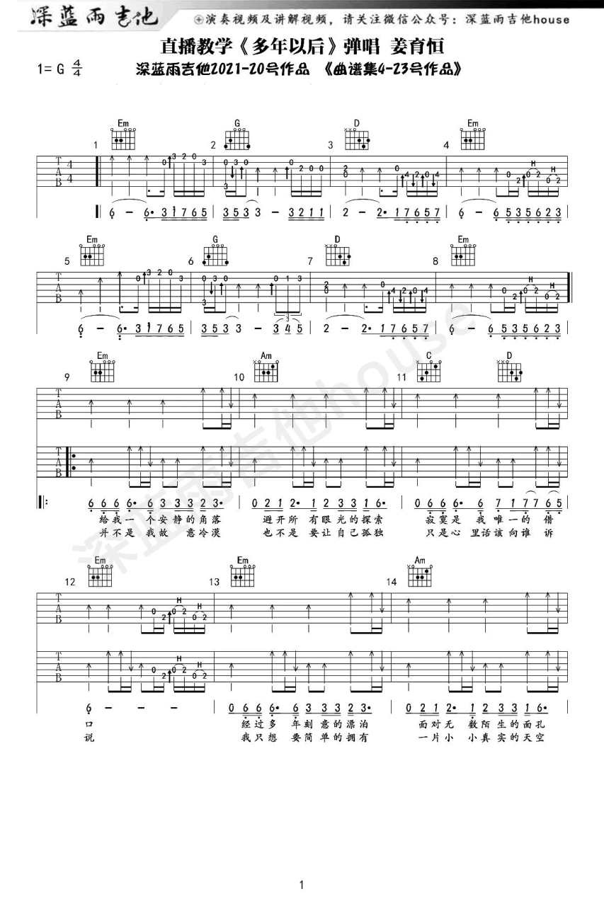 多年以后吉他谱,姜育恒歌曲,G调指弹简谱,新手弹唱弹唱谱