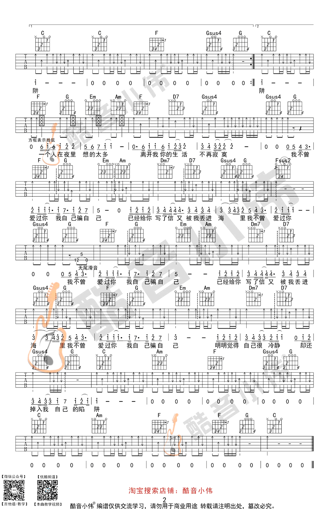 陷阱吉他谱,原版王北车歌曲,简单C调指弹曲谱,高清六线乐谱教学