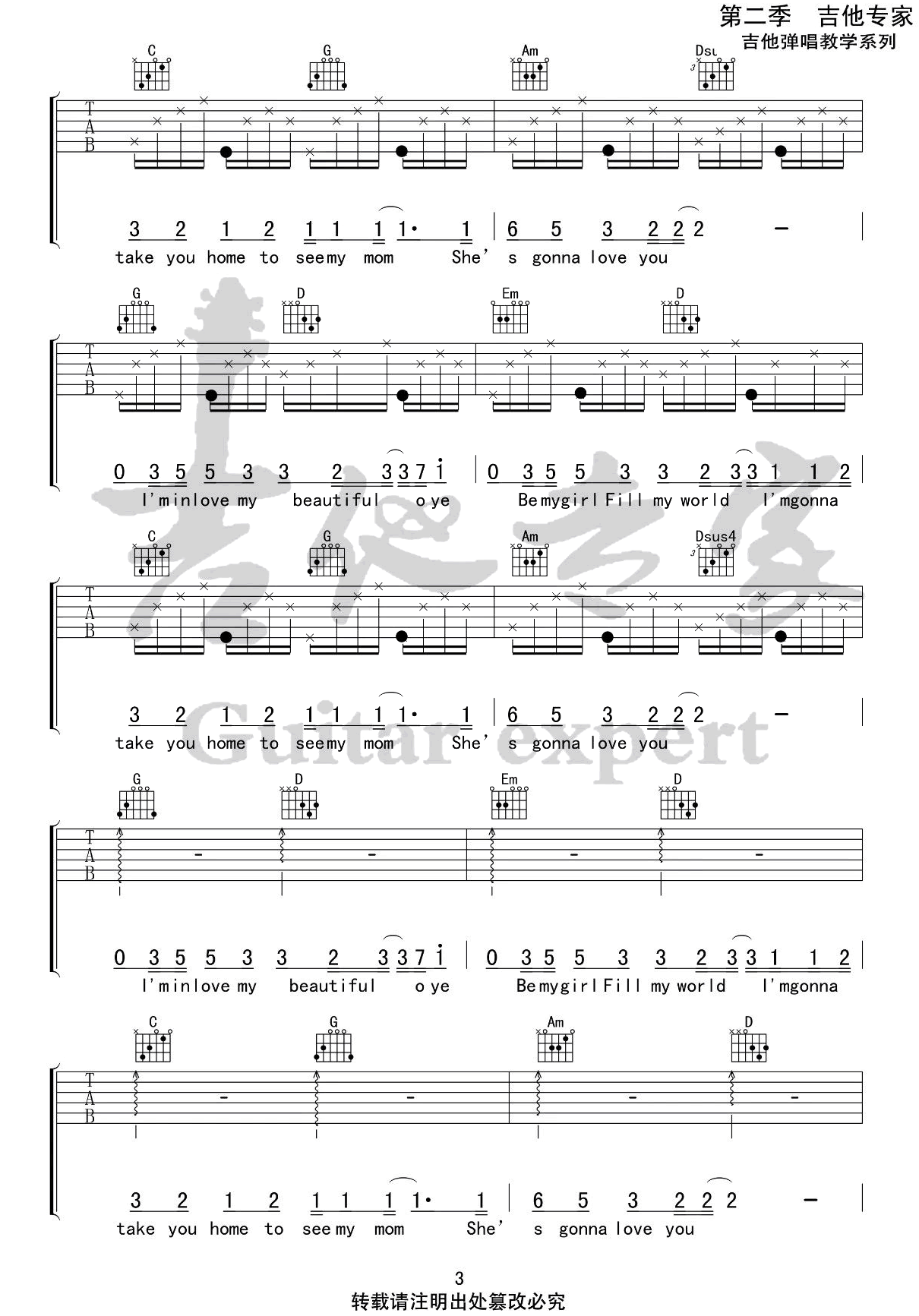 永远都会在吉他谱,取自演唱的歌曲是经典G调指弹编配的曲谱,非常好听的弹唱曲谱,下面3张高清曲谱由吉曲谱网为大家更新分享,有喜欢吉它的朋友欢迎关注!