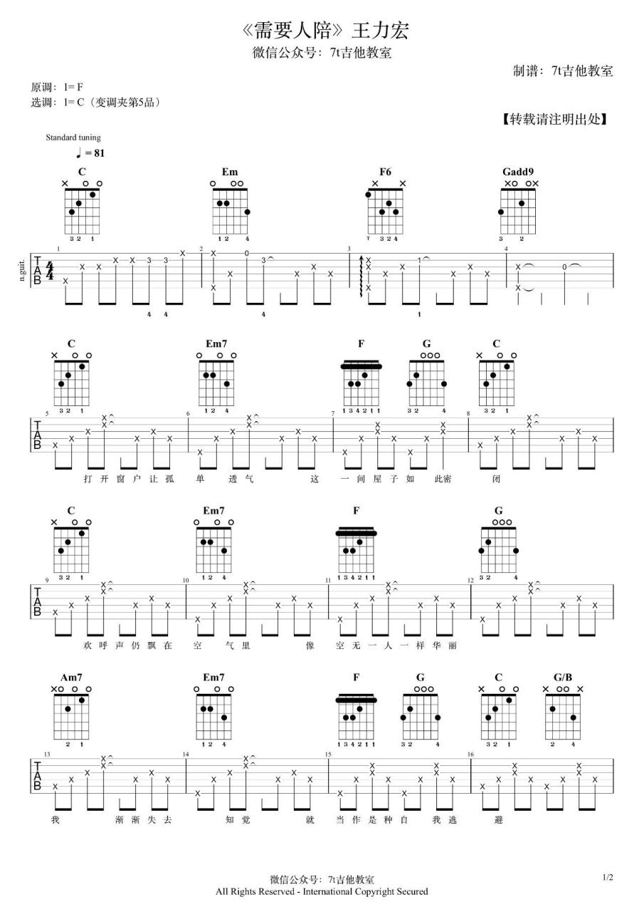以上就是王力宏的C调版的(需要人陪)曲谱全部内容,如果正是您所寻找的六线高清图片谱,希望能收藏本站,这里会源源不断更新各种王力宏的曲谱。此外,除了文字版谱子外,网站还提供了丰富的图片和视频资源,让学习更加生动有趣。不论你喜欢摇滚、流行、民谣还是古典音乐,这里都有适合你的吉他谱子。