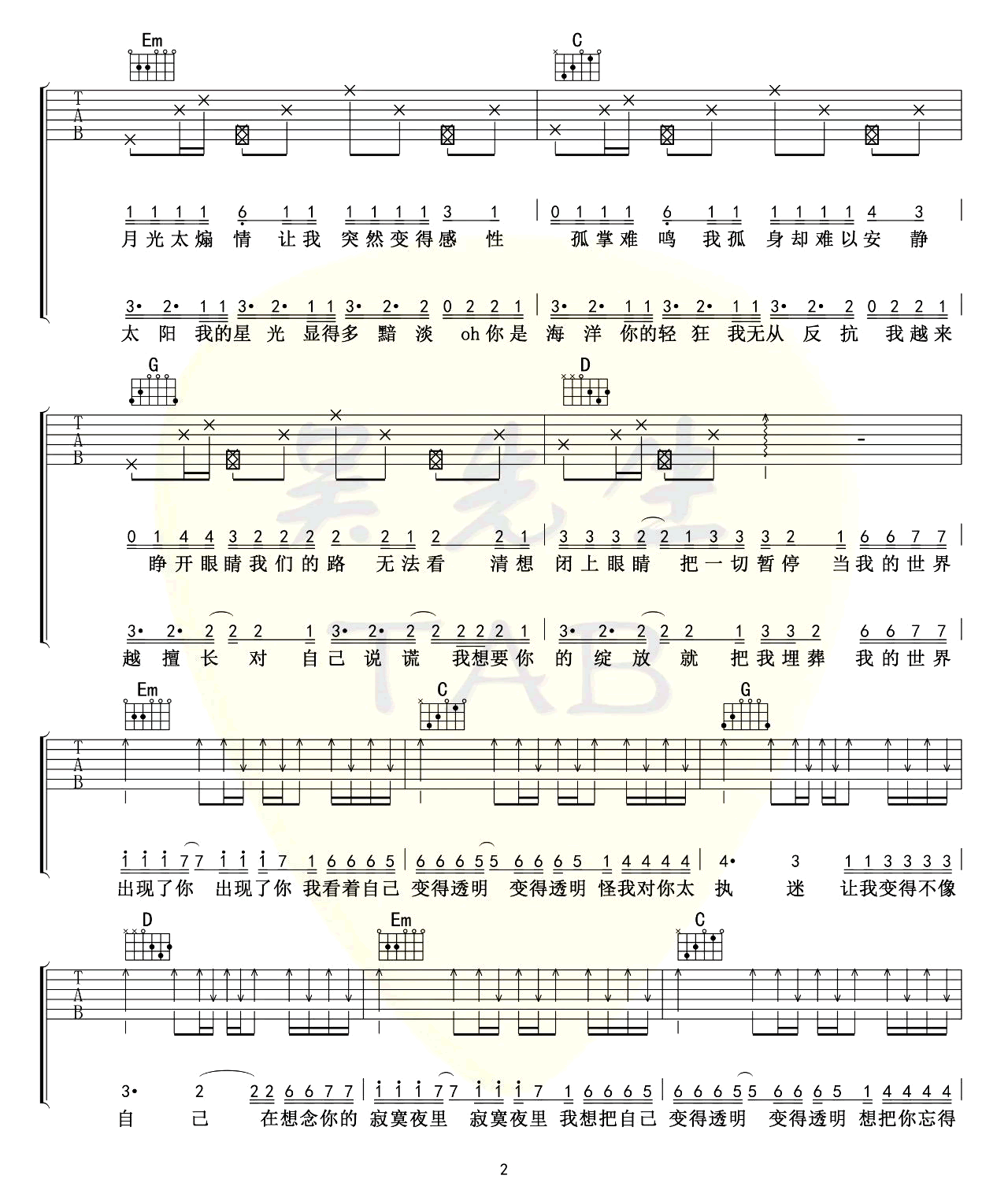 《透明吉他谱_邓紫棋_《透明》G调原版弹唱高清六线谱免费分享,《透明》是由邓紫棋作词作曲并演唱的一首最新歌曲。这个歌曲强而有力的鼓点贯穿全曲,将歌曲情绪随主副歌层次逐渐拉抬,是融合说唱与都会节奏蓝调音乐元素的新型态抒情歌。此版本的曲谱来源于吴先生扒谱制谱,歌曲原调为降A调,这里采用了G调指法根据原版进行编配,演唱时夹变调夹1品回到原调。这个歌曲编配难度不大,但前奏部分的几个切分节奏需要注意一些,后面的节奏型及和弦都十分简单。