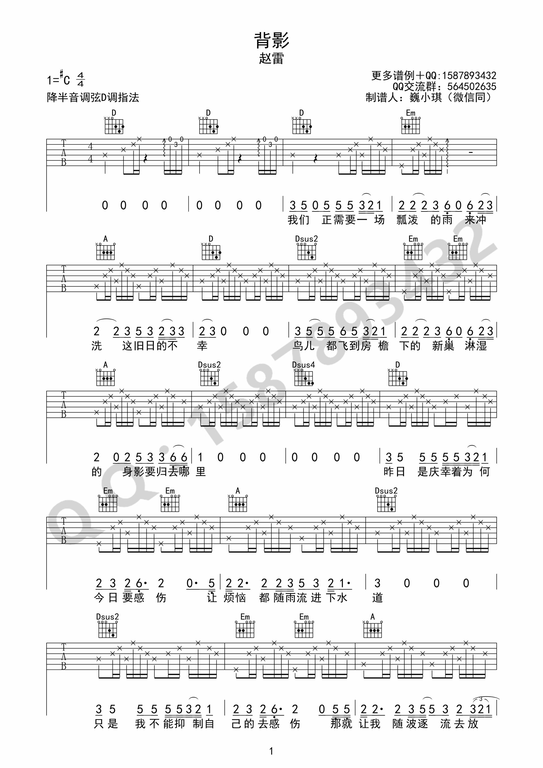 背影吉他谱,它是赵雷演唱的歌曲,由网络转载编配制谱,是一首经典歌曲编配的 G调指弹编配的曲谱,