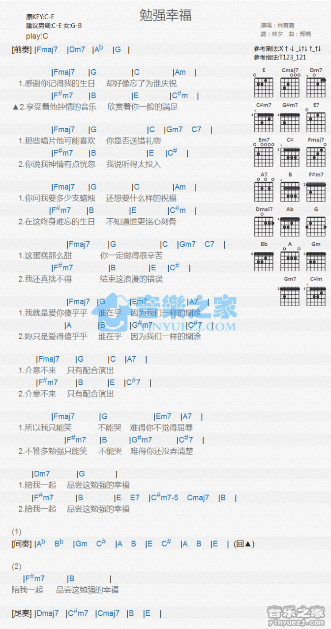 如果您想要学习林宥嘉演唱的《勉强幸福》的吉他谱,那么您来对地方了。这首弹唱简谱这首歌让我感到兴奋和振奋.这个完整版弹唱简谱是由音乐之家制谱编配的,适合新手入门学习C调教学吉他谱。这是一首非常好听的歌曲,下面高清图片谱由极网吉它谱更新分享。如果您是吉他爱好者请关注我们的网站!
