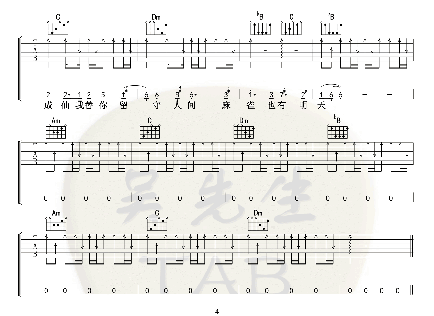 《麻雀吉他谱_李荣浩_《麻雀》F调原版弹唱谱_麻雀六线谱分享,《麻雀》是由李荣浩演唱的一首最新歌曲。这个歌曲旋律虽然土,但是编曲尤其是吉他很有味道,用有格调的编曲包装“大俗旋律”是李荣浩如今惯用的手法,这样的手法可以打破多圈层达到全民传唱的效果。此版本的曲谱来源于吴先生扒谱制谱,这里采用了歌曲的原调F调指法根据原版进行编配,演唱时可根据自己的嗓音情况夹变调夹。这个歌曲编配有一定难度,F调的和弦有一些大横按,还有两种不同的扫弦节奏型。