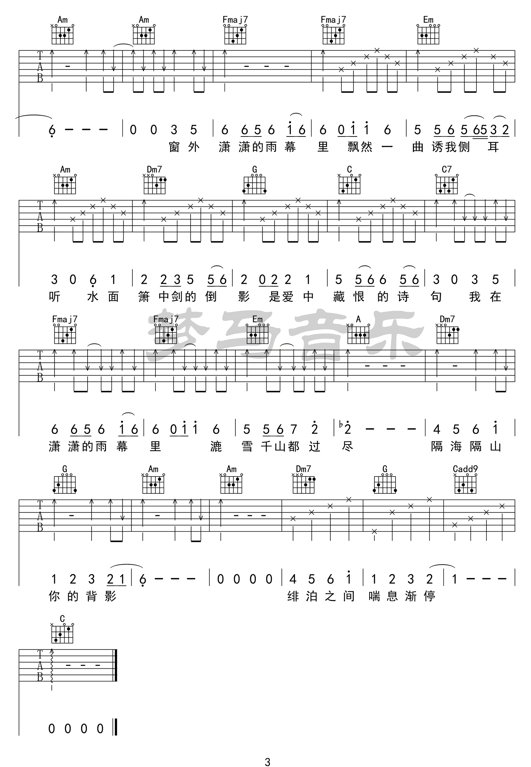 《雨幕吉他谱_许嵩_《雨幕》C调原版六线谱_吉他弹唱教学分享,《雨幕》是由许嵩创作并演唱的一首歌,这个歌曲是他为《新天龙八部》端游所创作的游戏主题曲,这个歌曲曲充满了江湖风雨的味道,你喜欢这个歌曲吗?