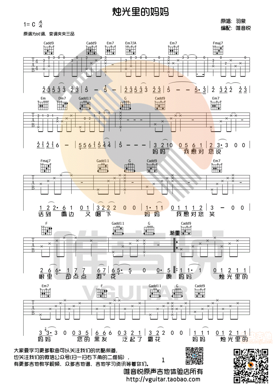 以上就是采用C调指法的原调版的(烛光里的妈妈)曲谱全部内容,如果正是您所寻找的六线高清图片谱,希望能收藏本站,这里会源源不断更新各种采用C调指法的曲谱。我们提供简单易学的简谱和教学视频,尤其适合初学者;如果你想弹唱歌曲,我们也有带有歌词和伴奏的吉他谱供你使用。